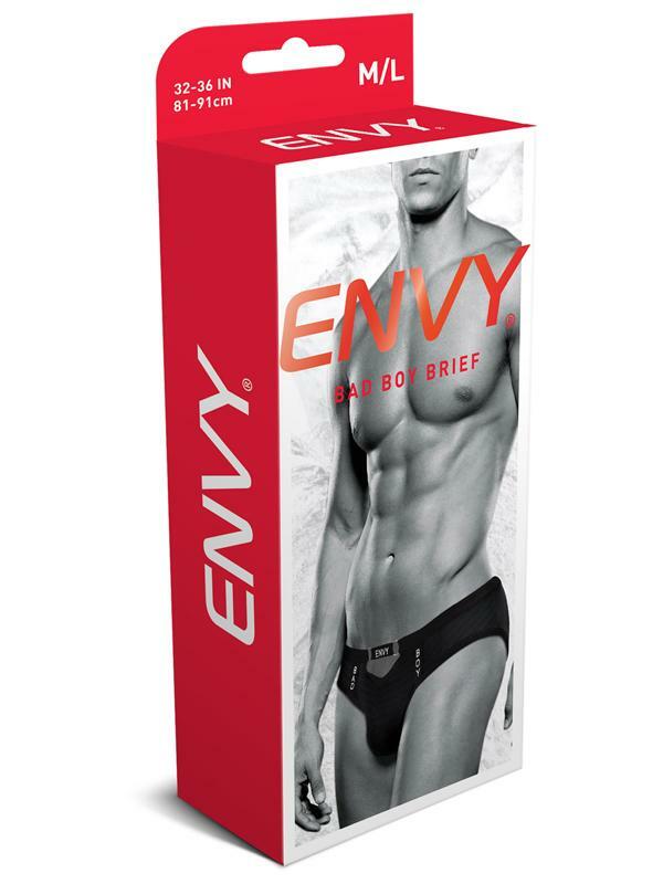What sets this brief apart is the playful keyhole cutout at the front, adding a touch of fun and intrigue. The cutout is emblazoned with the ENVY logo, showcasing the brand's attention to detail and quality. Additionally, the BAD BOY logo is vertically placed on each hip, allowing you to embrace your inner rebel.