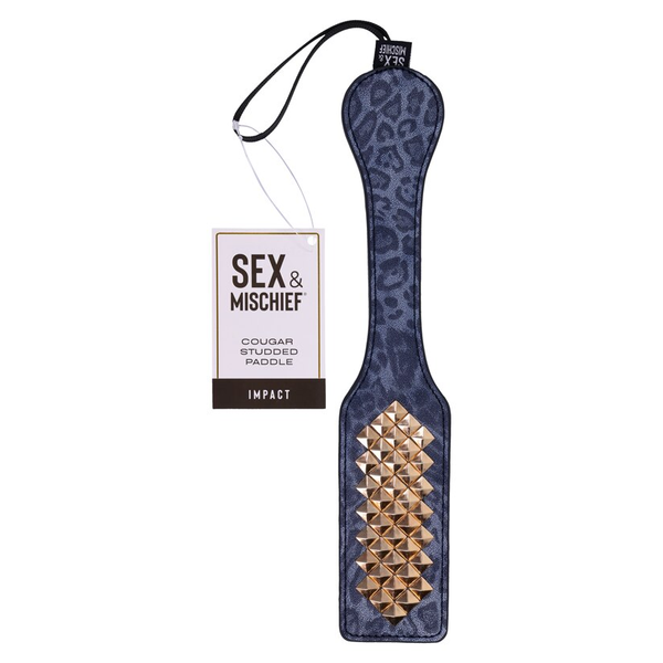 Unleash your wild side with the Sex And Mischief Cougar Studded Paddle, a stylish and satisfying addition to your playtime collection. Designed for those who love to tease and tantalize, this paddle combines rich blue leopard printed faux leather with gleaming gold studs for an extra sting upon impact.