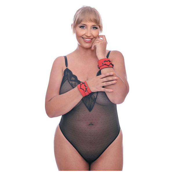Embrace the seductive allure of BDSM with the Amor Handcuffs from Sex And Mischief. These stylish wrist cuffs are designed to add a romantic yet daring touch to your intimate moments. Crafted from sumptuous red vegan leather with contrasting black metal heart accents, they offer both comfort and aesthetic appeal.