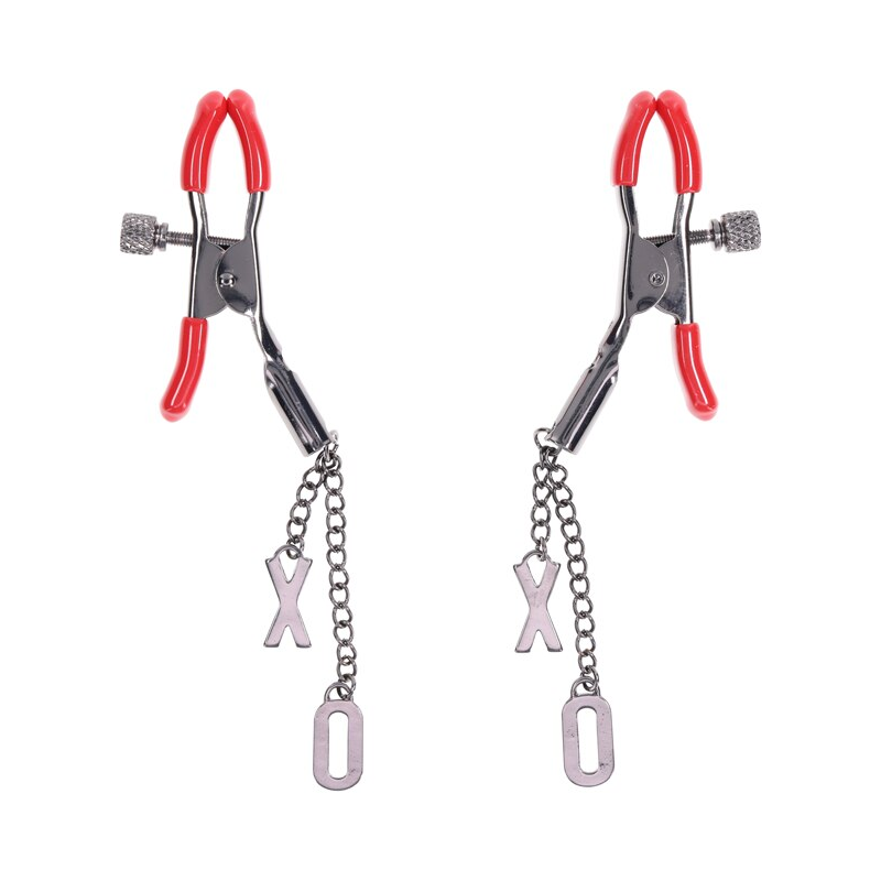Indulge in a blend of pleasure and style with the Sex And Mischief Ex's and Oh's Nipple Clamps. These elegant gunmetal clamps feature soft red rubber tips designed for a comfortable yet tantalising experience. Perfect for beginners and beyond, the adjustable tension offers customisable pressure, ensuring a perfect fit for any wearer.