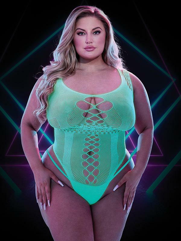 The Lapdance Glow In The Dark High-Cut Teddy - Queen is crafted from sheer mesh with glow-in-the-dark capabilities. The high-cut design sits perfectly on the hips, while the low scoop neckline and geometric cutouts along the shoulders and torso add allure and sensuality. The geometric cutout band at the waist completes the look with a touch of sophistication.