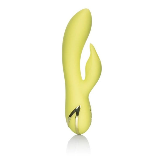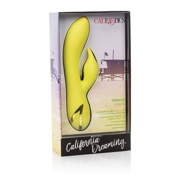 Give your clit a hot and warm embrace with the California Dreaming - Venice Vixen Rabbit Vibrator. The remarkable teaser with a sensual clitoral encaser delivers an out-of-the-ordinary pleasure experience. Its exceptional and extra-powerful dual motors, one embedded in the tip and the other inside the clitoral stimulator, feature 3 independent shaft speeds in the tip and 10 rumbling vibration modes including multiple speeds and patterns.