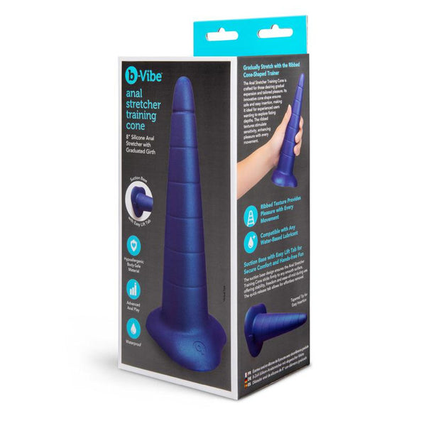 Elevate your anal play with the B-Vibe Anal Stretcher Training Cone, expertly crafted for safe and gradual stretching. This innovative cone-shaped trainer features a steadily widening shaft with ribbed textures, ensuring secure insertion and enhanced stimulation as you progress. Made from hypoallergenic, body-safe liquid silicone, it's gentle on the skin and easy to clean, while its waterproof design makes it perfect for use in the shower or bath.
